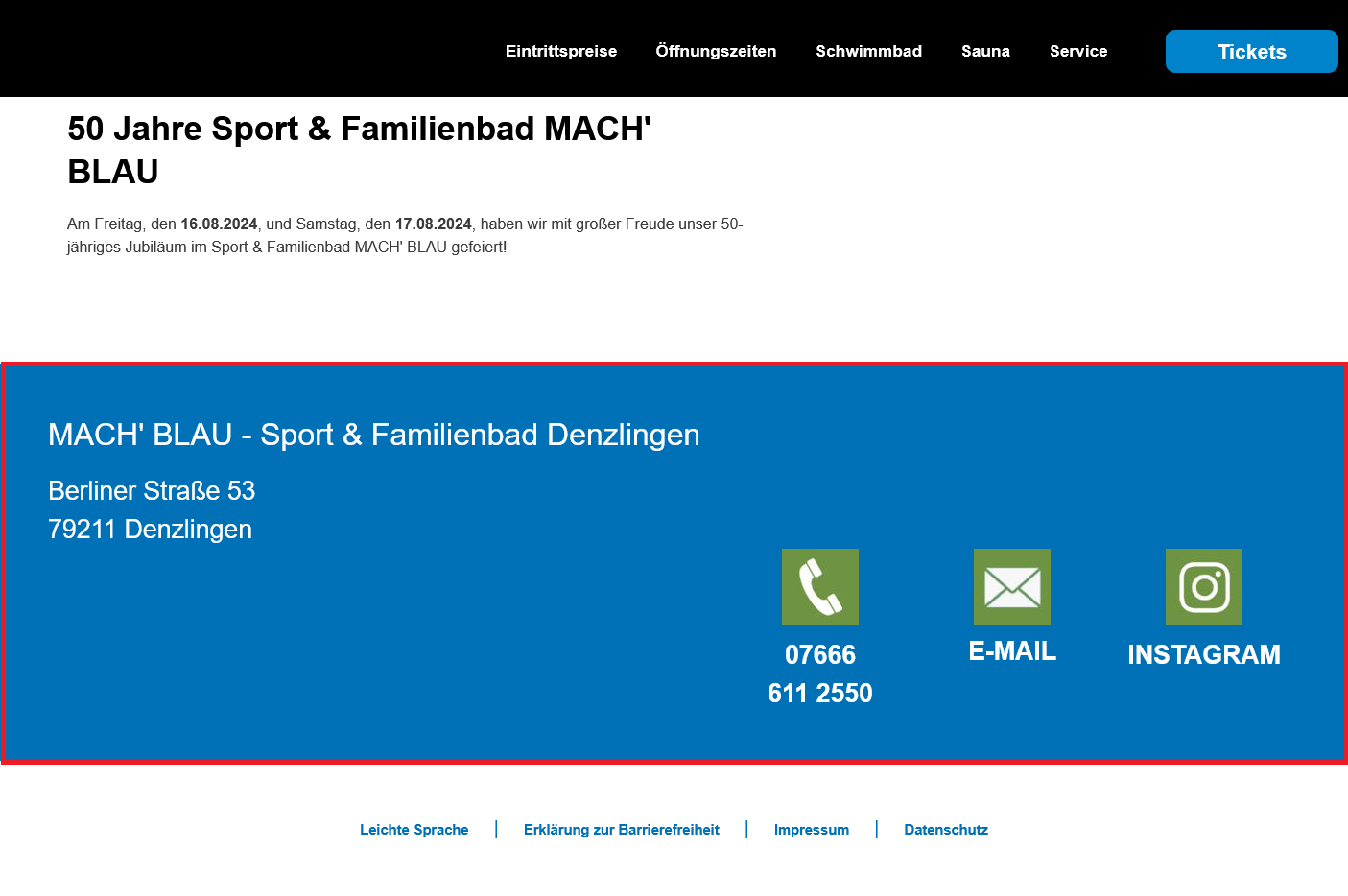 Im Balken stehen die Kontakt · daten des Bades.